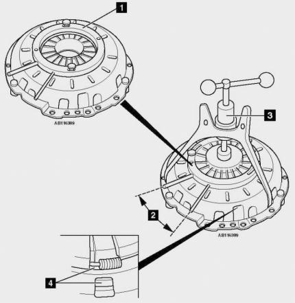 - Если нажимной диск сцепления будет использован повторно, то нанесите метки на нажимной диск сцепления для установки его в правильном положении относительно маховика.