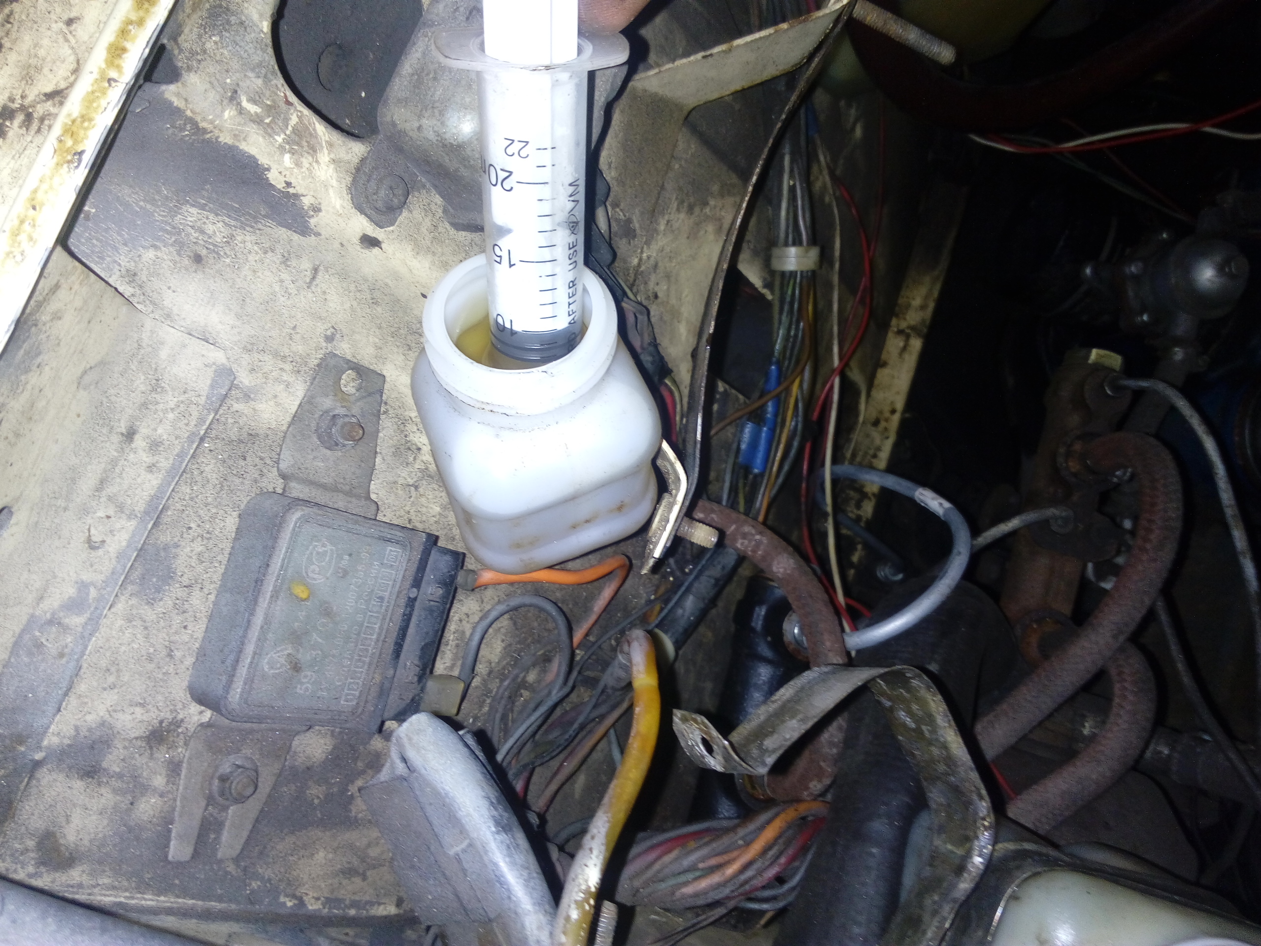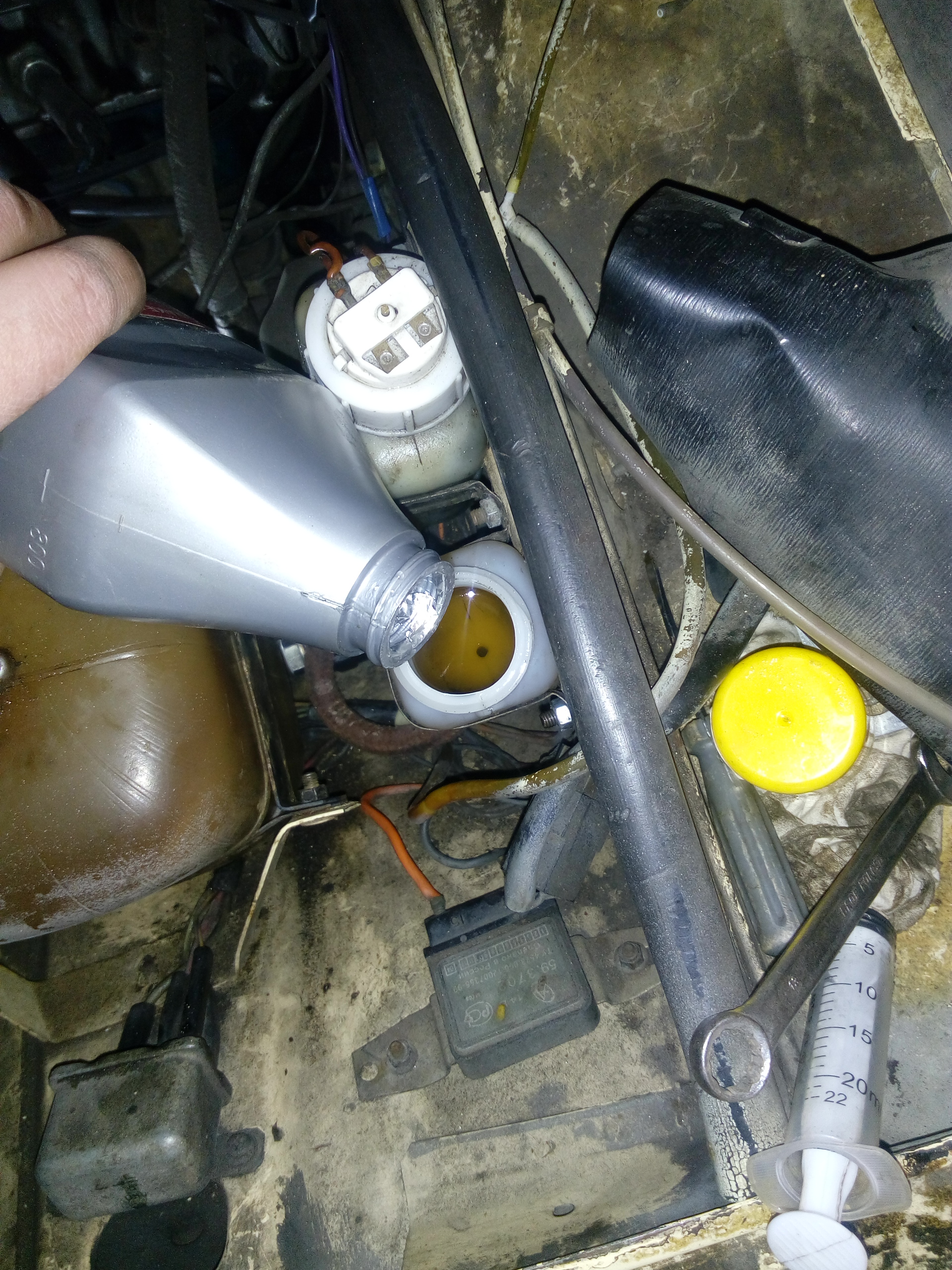 - Наливаем жидкость в отверстие для тормозной трубки.