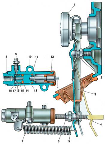 Механизм сцепления, компоненты: 1 – подшипник выключения сцепления; 2 – шаровая опора; 3 – вилка выключения сцепления; 4 – толкатель; 5 – регулировочная гайка; 6 – контргайка; 7 – оттяжная пружина; 8 – пробка корпуса; 9 – штуцер для прокачки; 10 – корпус цилиндра; 11 – уплотнительное кольцо; 12 – защитный колпачок; 13 – поршень; 14 – уплотнитель; 15 – тарелка; 16 – пружина;17 – опорная шайба; 18 – стопорное кольцо.