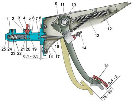 Строение механизма: 1 – корпус главного цилиндра; 2 – перепускное (компенсационное) отверстие; 3 – прокладка штуцера; 4 – штуцер; 5 – стопорная пружинная шайба; 6 – поршень главного цилиндра; 7 – уплотнительное кольцо; 8 – поршень толкателя; 9 – крючок; 10 – ось педалей; 11 – кронштейн педалей сцепления и тормоза; 12 – пружина сервопривода педали сцепления; 13 – оттяжная пружина педали сцепления; 14 – ограничитель хода педали сцепления; 15 – педаль сцепления; 16 – толкатель поршня; 17 – защитный колпачок; 18 – стопорное кольцо; 19 – впускное отверстие; 20 – уплотнительное кольцо (кольцевой клапан); 21 – перепускное отверстие поршня; 22 – рабочая полость цилиндра; 23 – пружина; 24 – прокладка; 25 – пробка.