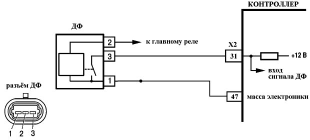Сигнал датчика фаз (далее ДФ) используется контроллером ЭСУД для организации впрыска топлива. Принцип действия ДФ основан на эффекте Холла. На шкиве распредвала управляющего впускными клапанами расположен задающий диск с прорезью. При прохождении прорези через паз ДФ, датчик образует импульс сигнала уровня «земли» (около 0В). Этот момент соответствует положению поршня первого цилиндра в такте сжатия.