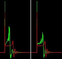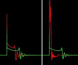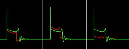 Рассмотрим на примере осциллограмм конкретные примеры неисправностей. На рисунках красным цветом обозначены графики неисправной системы зажигания, соответственно, зеленым — исправной.