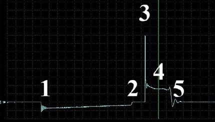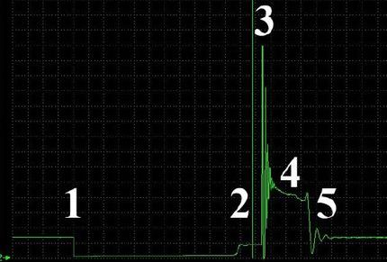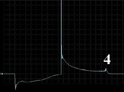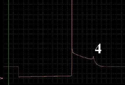 На рисунке слева вы можете видеть осциллограмму напряжения на управляющем выводе первичной обмотки неисправной индивидуальной КЗ. Признаком неисправности является отсутствие затухающих колебаний после окончания горения искры между электродами свечи (участок “4”).