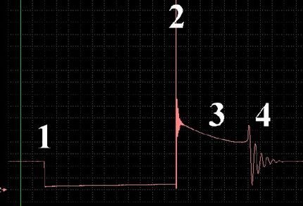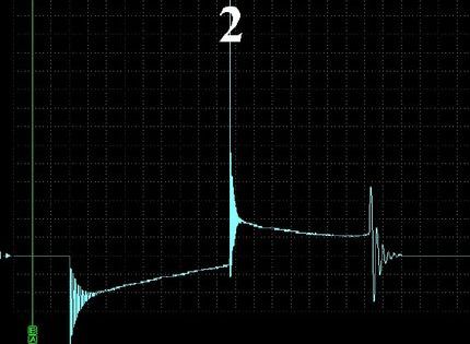 Осциллограмма импульса высокого напряжения исправной компактной индивидуальной КЗ, полученная при помощи емкостного датчика. Наличие затухающих колебаний сразу после пробоя искрового промежутка между электродами свечи (участок отмечен символом “2”) является следствием конструктивных особенностей катушки и не является признаком неисправности.