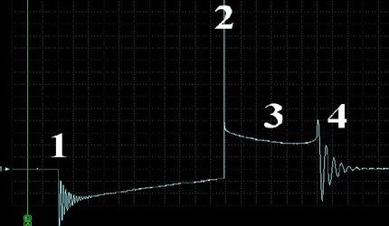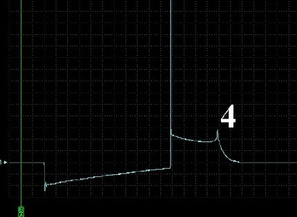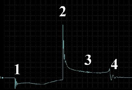 Осциллограмма импульса высокого напряжения неисправной компактной индивидуальной КЗ, полученная при помощи емкостного датчика. Признаком неисправности является отсутствие затухающих колебаний после окончания горения искры между электродами свечи (участок отмечен символом “4”).