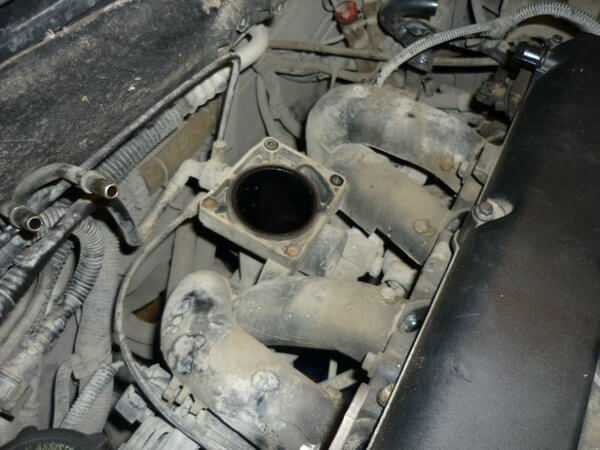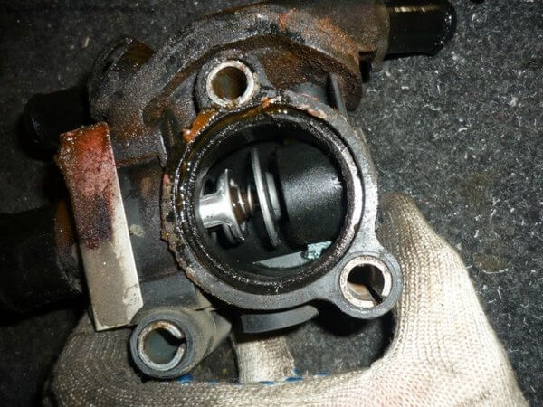 Сливаем антифриз, отсоединяем все шланги, идущие от термостата, снимаем корпус термостата. Бачок ОЖ нужно открутить, после отвести в сторону.