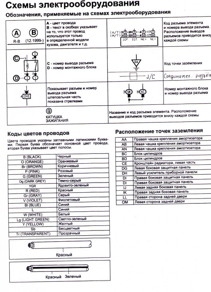 Ниже приведены обозначения, которые применяются на схемах, цвета проводов и расположение точек заземления: