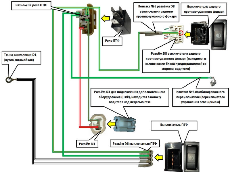 29.Провод зеленого цвета, который идет от разъёма D2 реле ПТФ нужно соединить с зелёным проводом (выводом №2 разъёма D8 выключателя заднего противотуманного фонаря – это и есть контакт №6 комбинированного переключателя).