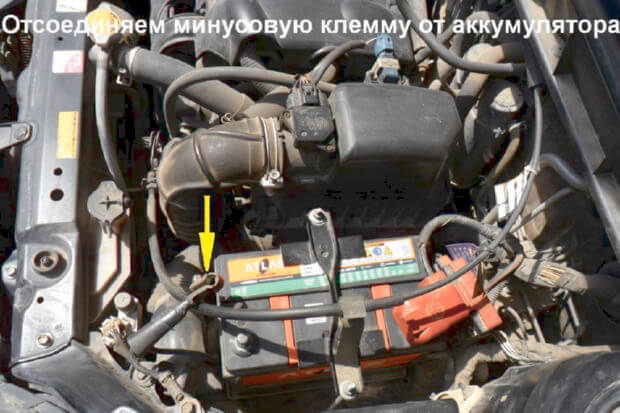 1.Нужно отсоединить минусовую клемму от АКБ.
