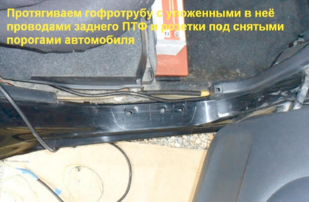 10.Гофротрубу, в которой уже уложены провода розетки и заднего ПТФ протягиваем под снятыми порогами автомобиля. Проложенная проводка увязывается кабельными стяжками и изолентой. Теперь устанавливаем обратно накладку, задние пороги, все устанавливается в порядке обратном снятию.