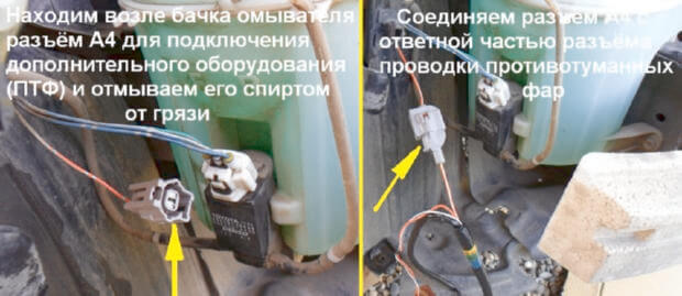 11.Возле бачка омывателя нужно найти разъём A4, к этому разъему будет подключено дополнительное оборудования (ПТФ), разъем нужно отмыть от грязи. Разъём А4 нужно соединить с ответной частью разъема проводки ПТФ.