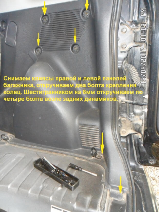 11.Начинаем снимать левую и правую панели багажника. Чтобы снять панели нужно сначала убирать крышку, которая закрывает докатку с домкратом. Вытаскиваем клипсы левой и правой панелей, не забываем открутить два болта крепления колец. После берем шестигранник на 8мм и им откручиваем четыре болта рядом с задними динамиками.