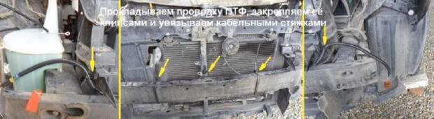 12.Прокладываем проводку ПТФ, закрепляем её клипсами и увязываем кабельными стяжками.