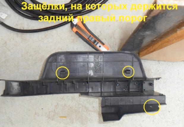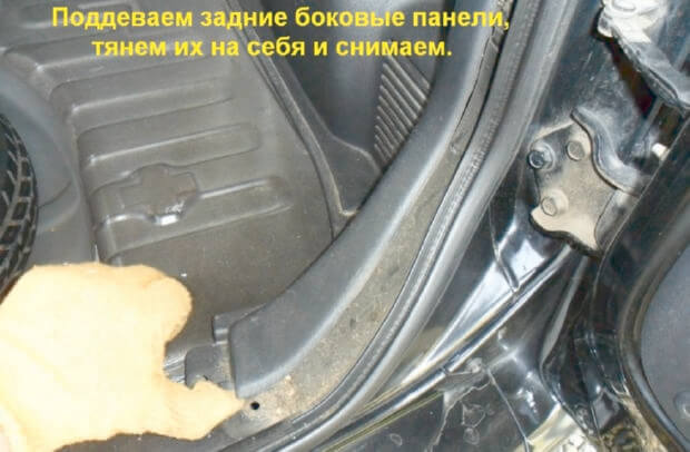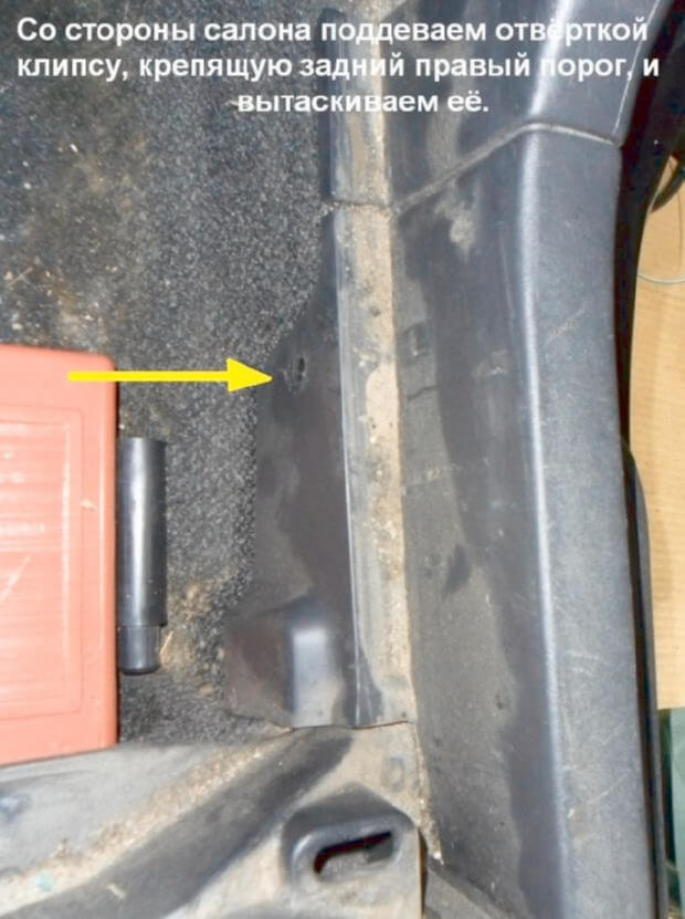 7.Начинаем снятие заднего порога. Для этого нужно снять фальшпол рядом с правым заднем креслом. Со стороны салона отверткой поддеваем клипсу, которая крепит задний правый порог, ее нужно вытащить.