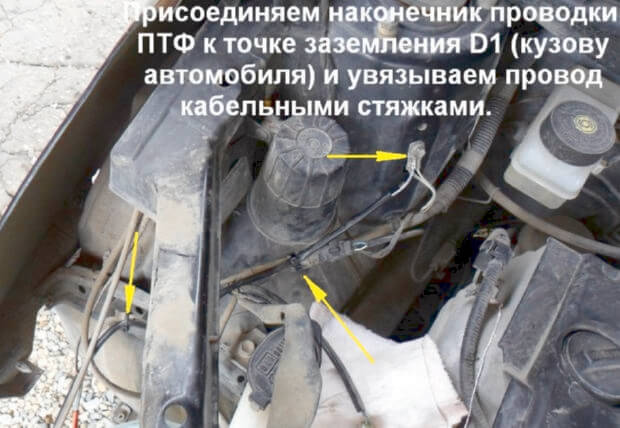 13.Наконечник проводки ПТФ нужно присоединить к точке D1 (кузову автомобиля), провод нужно увязать при помощи кабельных стяжек.