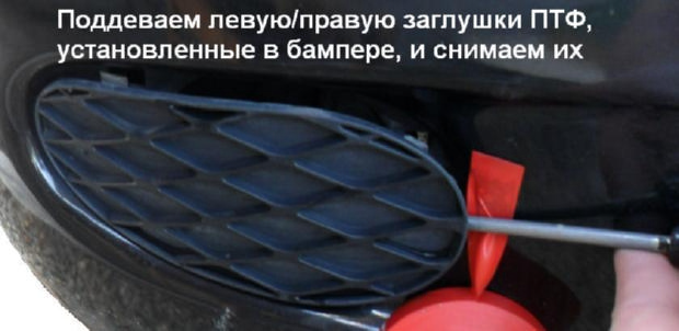 14.Отвёрткой на бампере поддеваем правую/левую заглушку ПТФ, и снимаем их.