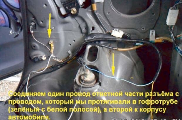 16.Один провод ответной части разъёма нужно соединить к проводу, который был протянут в гофротрубе (зелёного цвета, с белой полоской), а второй присоединяется к корпусу автомобиля.