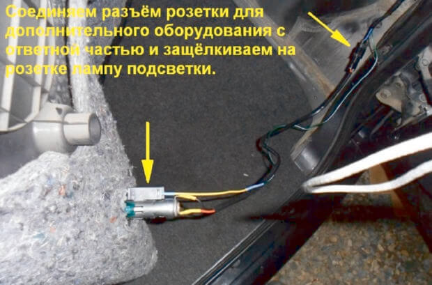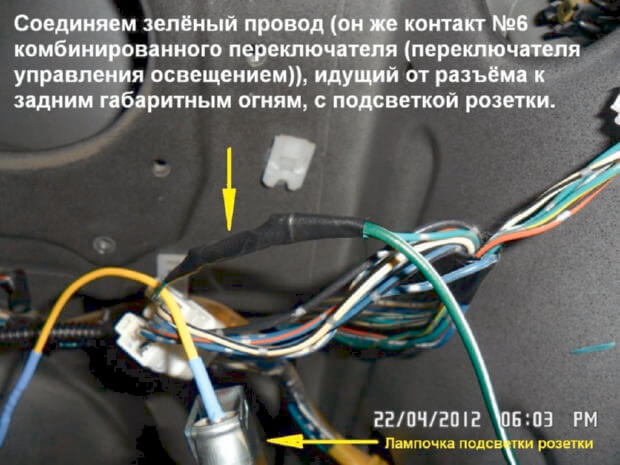 17.Зелёный провод, который идет от разъёма к задним габаритным огням нужно соединить с подсветкой розетки.