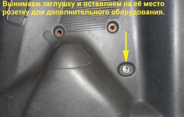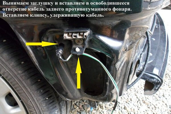 30.Вытаскиваем заглушку, в освободившееся отверстие вставляется кабель заднего ПТФ, не забудьте вставить клипсу, которая удерживает кабель.
