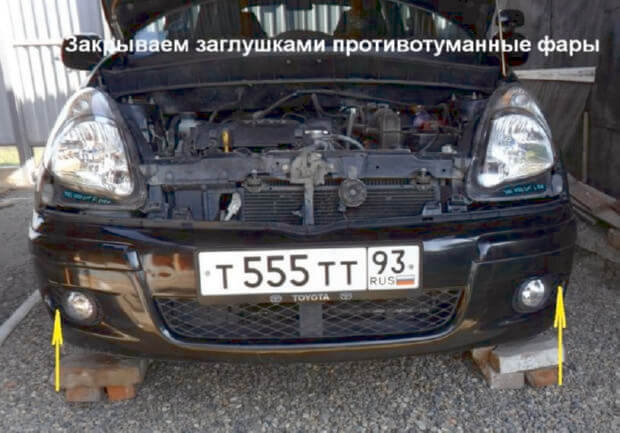 16.Теперь бампер можно ставить на место, ставится он в обратном порядке, не забываем вытащить разъёмы НВ4, они служат для подключения противотуманных фар. Фары я решил установить от Toyota Yaris Verso, прикрутил их саморезами, в фары нужно вставить патроны с лампами габаритов и поворотников, лампы головного света ставим обратно и присоединяем к ним разъёмы электропитания.