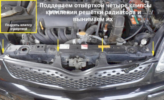 2.Отвёрткой поддеваем и вынимаем четыре клипсы крепления решетки радиатора.