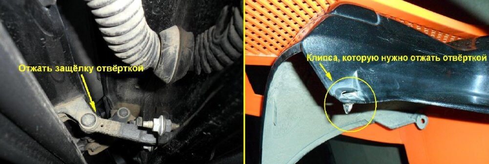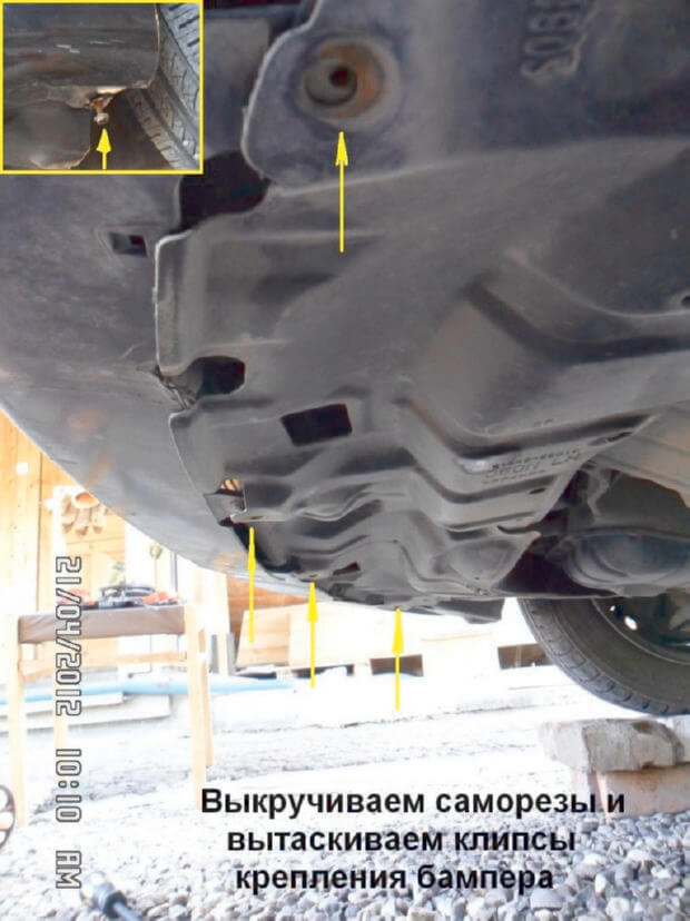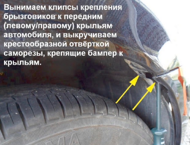 8.Клипсы крепления брызговиков к правому и левому передним крыльям автомобиля вытаскиваются, после крестообразной отвёрткой выкручиваются саморезы, которые крепят бампер к крыльям.