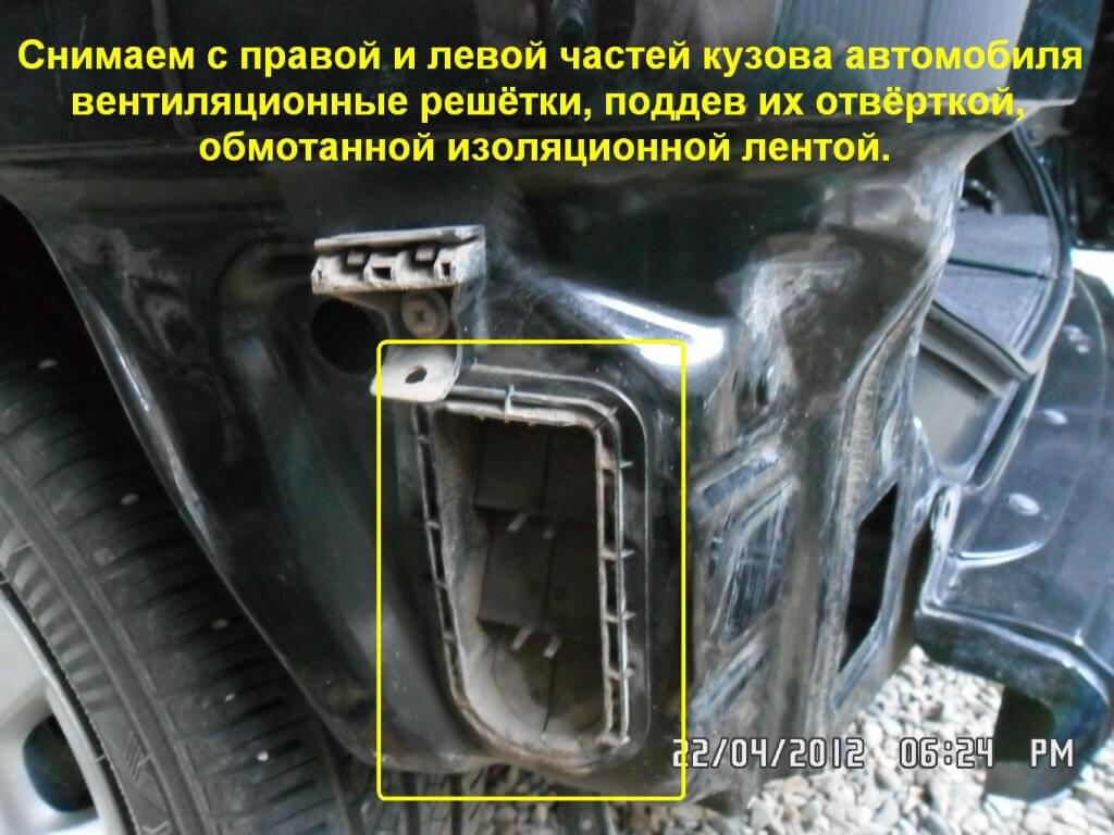 23.Снимаем с обеих сторон кузова машины вентиляционные решётки, их нужно поддевать отвёрткой, которую предварительно нужно обмотать изоляционной лентой.