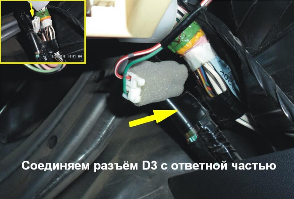 23.Разъём D3 нужно соединить с ответной частью (она расположена в ногах водителя над педалью газа). Часто разъёмы для подключения доп оборудования в автомобилях марки Toyotа приматываются к жгутам проводов изоляционной лентой белого цвета, я ориентировался на это.