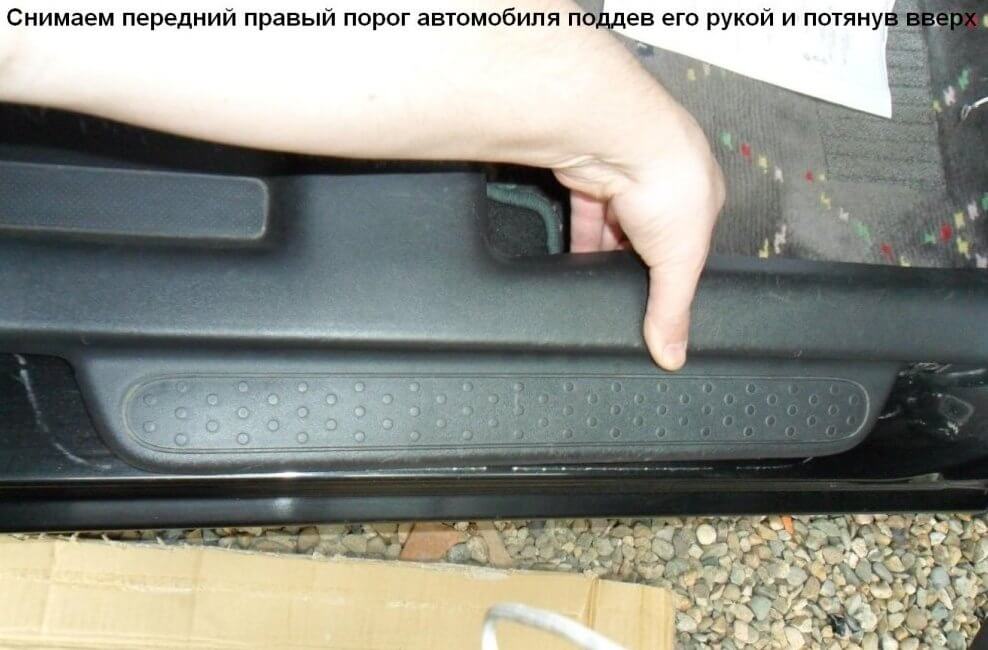 24.Начинаем снимать правый передний порог, его нужно поддеть рукой и потянув вверх.