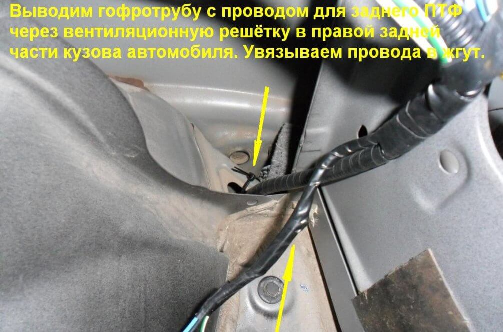 24.Гофротрубу с проводом для заднего противотуманного фонаря выводим через решётку вентиляции в правой задней части кузова. Провода нужно увязать в жгут.