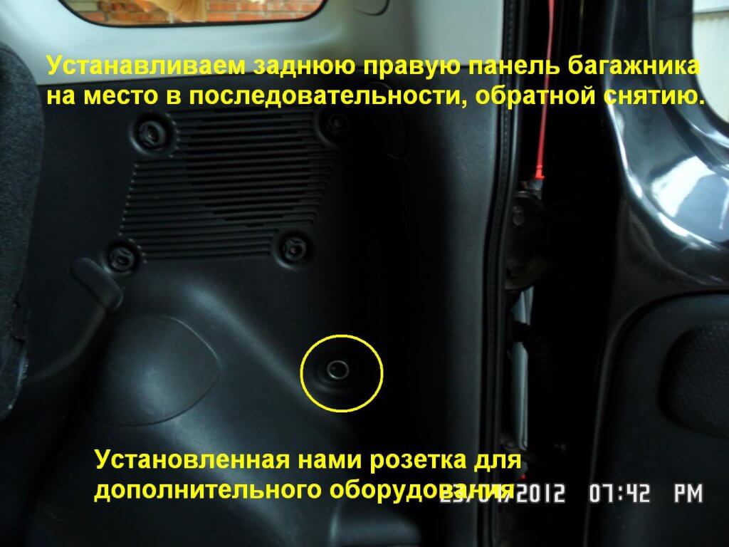 18.Из снятой правой панели багажника вытаскиваем заглушку, а на ее место вставляется розетка для дополнительного оборудования.