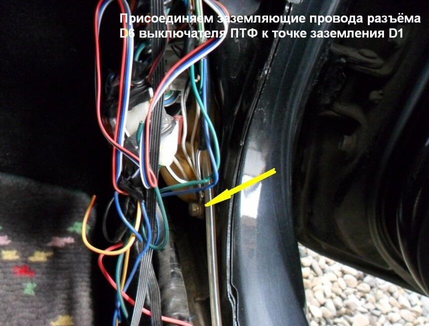 27.Заземляющие провода выключателя ПТФ разъёма D6 нужно присоединить к точке заземления D1 (корпус автомобиля). Кубло проводков рядом с точкой заземления – это шлейфы сигнализации, которые были установленные криворукими «работничками» предыдущему хозяину автомобиля.