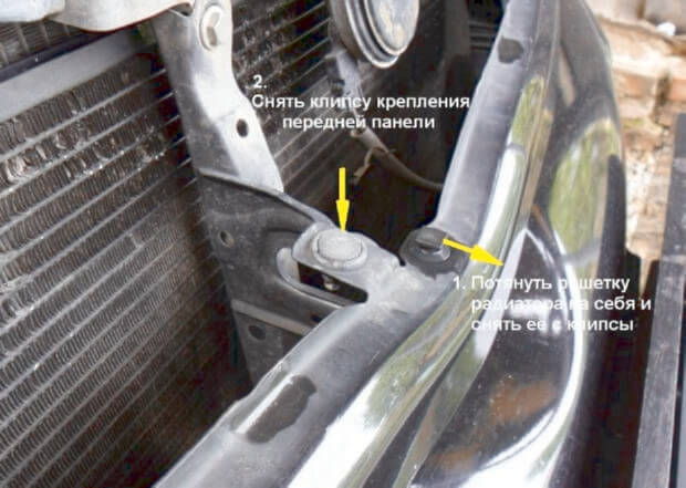 3.Решётку радиатора тянем на себя, ее нужно снять с клипсы. Клипса крепления передней панели тоже снимается.