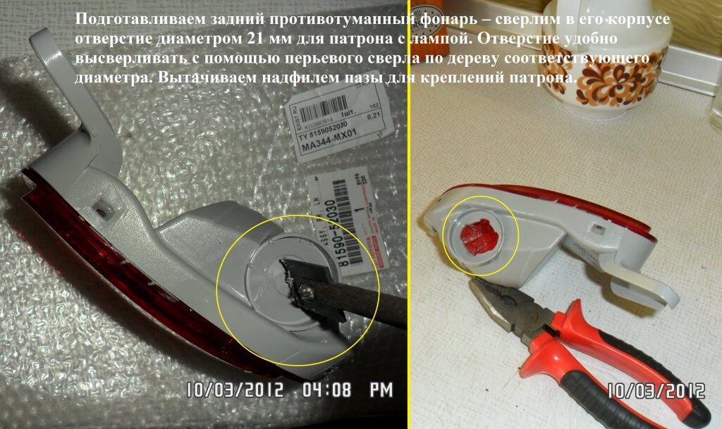 31.Начинаем подготавливать задний ПТФ – в его корпусе нужно просверлить отверстие (диаметр 21 мм) отверстие нужно для патрона с лампой. Данное отверстие удобно высверлить при помощи перьевого сверла по дереву. Пазы для креплений патрона нужно вытачить надфилем. Стружку, которая попала внутрь заднего противотуманного фонаря выдуваем пылесосом.