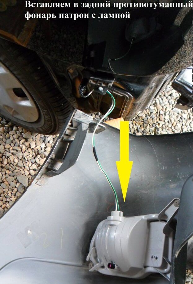 34.Перед установкой заднего противотуманного фонаря нужно вставить патрон с лампой. Устанавливаем фонарь на место, теперь можно поставить на место левую часть бампера.