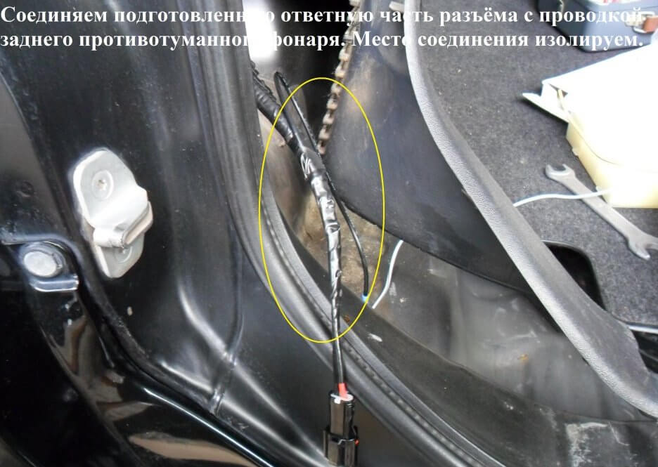 35.Подготовленную ответную часть разъёма нужно соединить с проводкой заднего ПТФ. Место соединения нужно заизолировать.
