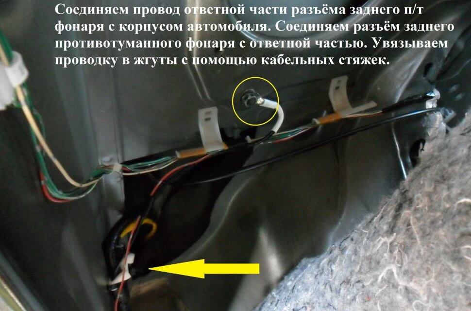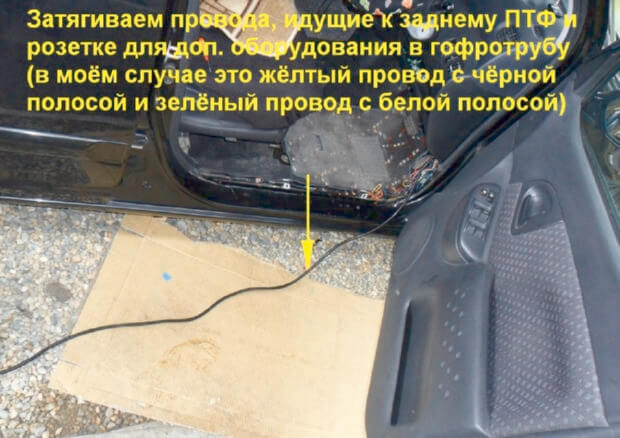 5.Провода, которые идут к розетке для дополнительного оборудования и заднему ПТФ нужно затянуть гофротрубу.