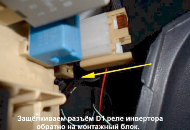 22.Сбоку, на монтажный блок, под панелью приборов защёлкивается разъём D2 с установленным реле противотуманных фар. Данная процедура выполняется крайне неудобно, поэтому, придется помучатся.