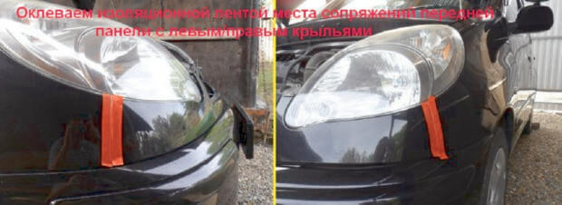 4.Для того чтобы, защитить лакокрасочное покрытие, перед тем, как начать снимать переднюю панель, изоляционной лентой нужно оклеить места сопряжения правого/левого крыльев машины с передней панелью.