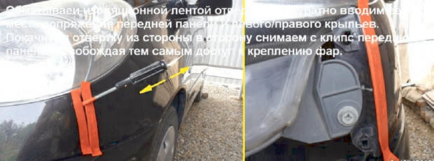 5.Отвертку желательно тоже обернуть изоляционной лентой, после нужно аккуратно вводить её в места, в которых передняя панели сопряжена с правым /левым передними крыльями. Двигая отвёртку из стороны в сторону, нужно снять с клипс переднюю панель, как панель будет снята, Вы сможете легко добраться до крепления фар головного света.
