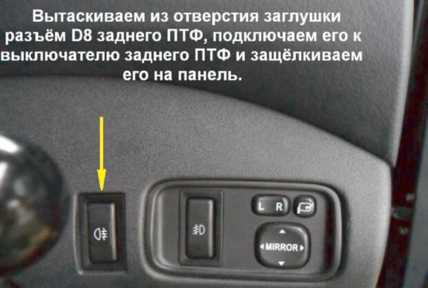 6.Из отверстия заглушки нужно вытащить и подключить разъём D8 к выключателю заднего ПТФ, выключатель ПТФ нужно защёлкнуть на панель. Кабельными стяжками желательно аккуратно увязать вновь проложенные проводки под панель приборов.