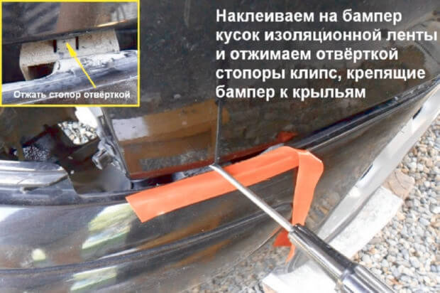9.На бампер наклеиваем кусок изоляционной ленты, далее отвёрткой отжимаются стопоры клипсы, которые крепят бампер к крыльям.
