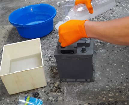 Хорошо размешав соду в воде, до полного растворения, можно заливать в банки АКБ. Держать раствор в аккумуляторе нужно 15-20 минут, а затем сливать. После такой манипуляции обязательно промойте (залить/слить) дистиллированной водой пару раз.
