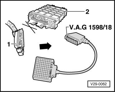 - Подключить адаптер -V.A.G 1598/22- к жгуту проводов блока управления двигателя;