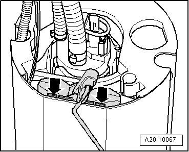 - Поддеть петли -3- и -4- отверткой и снять датчик уровня топлива сдвинув его вниз в направлении -стрелки-.