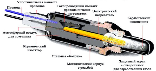 На основе оксида титана. При изменении состава выхлопа реагирует изменением электрического сопротивления.