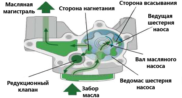 В корпусе устройства смонтированы шестерни, передающие масло с всасывающего на нагнетательный канал, откуда оно распространяется по системе. Производительность такого оборудования полностью зависит от частоты работы коленвала. Если давление становится чрезмерным, для его уменьшения необходимо сбросить в картер из системы немного масла. Осуществляется эта операция автоматически с применением редукционного клапана, реагирующего на повышение давления. Следует отметить, что вручную такой масляный насос двигателя регулировать невозможно.