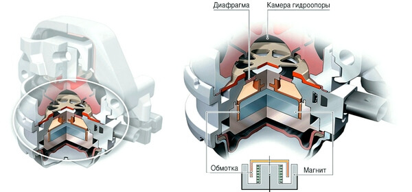 Гидравлическая опора двигателя считается гораздо более современной конструкцией. Такие системы способны подстраиваться под работу двигателя в различных условиях и максимально эффективно гасить любые вибрации. Подушка опоры двигателя также выполнена из трех основных элементов, но здесь это пара камер, между которыми располагается мембрана. Каждая из камер заполняется антифризом или гидравлической жидкостью. Задача подвижной мембраны – устранять незначительную вибрацию, возникающую на холостом и малом ходу по ровной дороге. Скоростные вибрации устраняются гидравлической жидкостью. Под воздействием изменяющегося давления, она перемещается между камерами, повышая жесткость опоры, что позволяет гасить даже самые сильные вибрации.